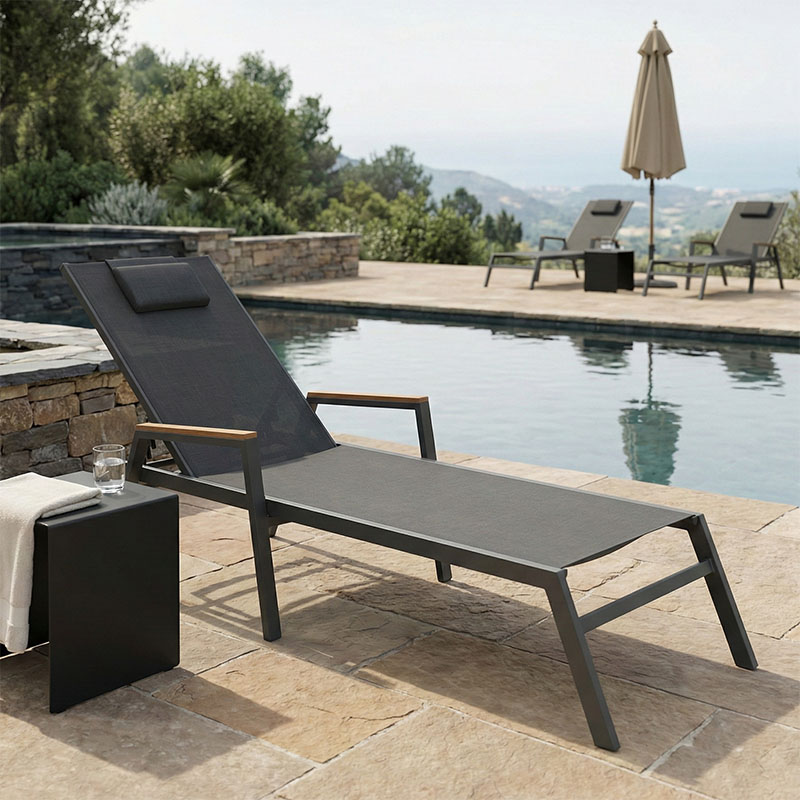 Τεχνικά χαρακτηριστικά: * Σταθερός σκελετός από υψηλής ποιότητας αλουμίνιο εποδειδικής βαφής ανθρακί χρώματος. * Επένδυση υφάσματος textinene 2x1 530gr ανθρακί χρώματος. Το textilene είναι ύφασμα μεγάλης αντοχής στην ηλιακή ακτινοβολία UV και την υγρασία, ενώ παράλληλα αφήνει το δέρμα να "αναπνέει" δημιουργώντας έτσι άνεση στην έδραση. * Τα μπράτσα είναι επενδεδυμένα με Polywood: ανακυκλωμένο HDPE, φιλικό προς το περιβάλλον κι ανθεκτικό. Χρησιμοποιείται ευρέως στην κατασκευή επίπλων κήπου λόγω της ιδιότητας του να κρατά το χρώμα ζωντανό αποτρέποντας τη φθορά που προκαλεί σε αυτό η ηλιακή ακτινοβολία. * Διαθέτει πολλαπλές θέσεις ανάκλισης * Φέρει προσκέφαλο για μεγαλύτερη άνεση * Είναι στοιβαζόμενη για εύκολη μεταφορά και αποθήκευση.