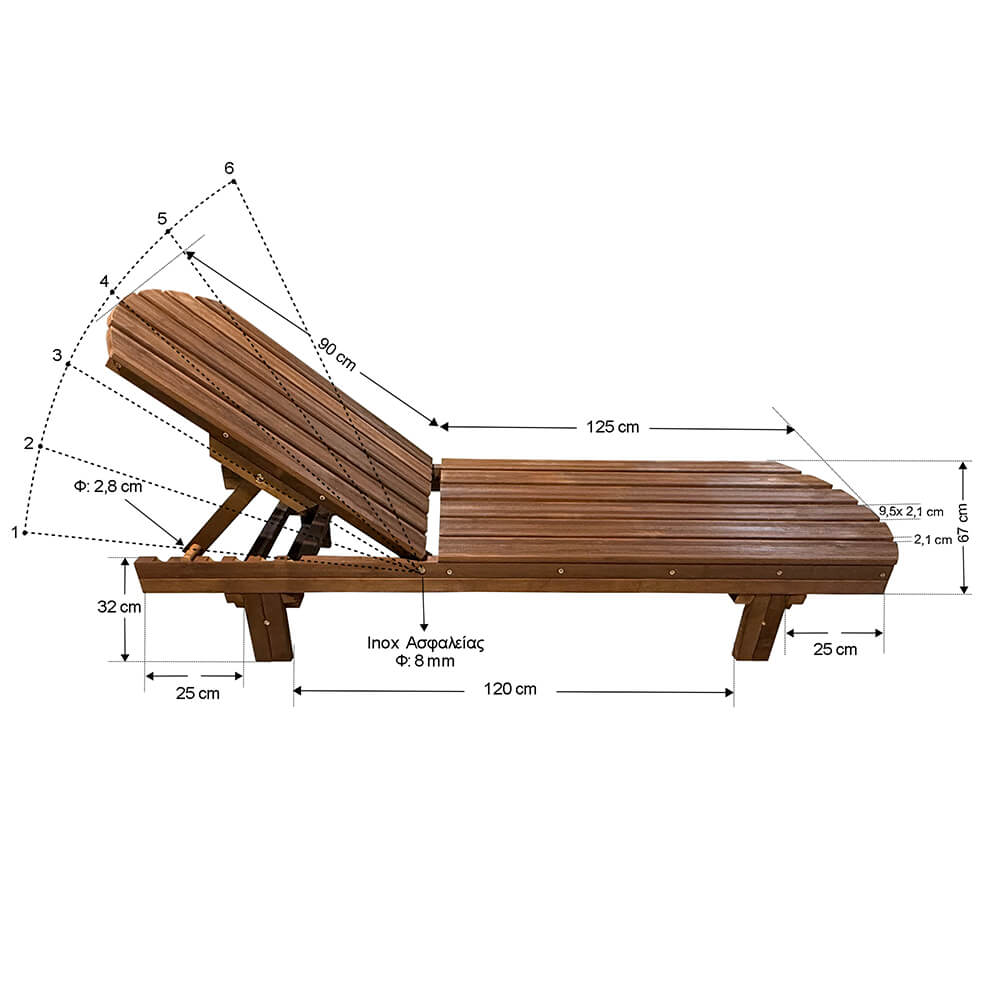 Η μοναδική στην αγορά που προσφέρει τη δυνατότητα να ρυθμίσετε την κλίση της ξαπλώστρας σε τόσες πολλές θέσεις Βίδες Inox πάχους 8mm με παξιμάδι ασφαλείας Εμποτισμός Αφού το ξύλο πάρει την τελική του μορφή μπαίνει σε ειδικούς κλιβάνους οι οποίοι γεμίζουν με νερό και συντηρητικό και κατόπιν δέχεται πίεση 12 ατμόσφαιρες για 3 περίπου ώρες με αποτέλεσμα το συντηρητικό να διεισδύει έως την καρδιά του ξύλου και να σταθεροποιούν την δομη του.