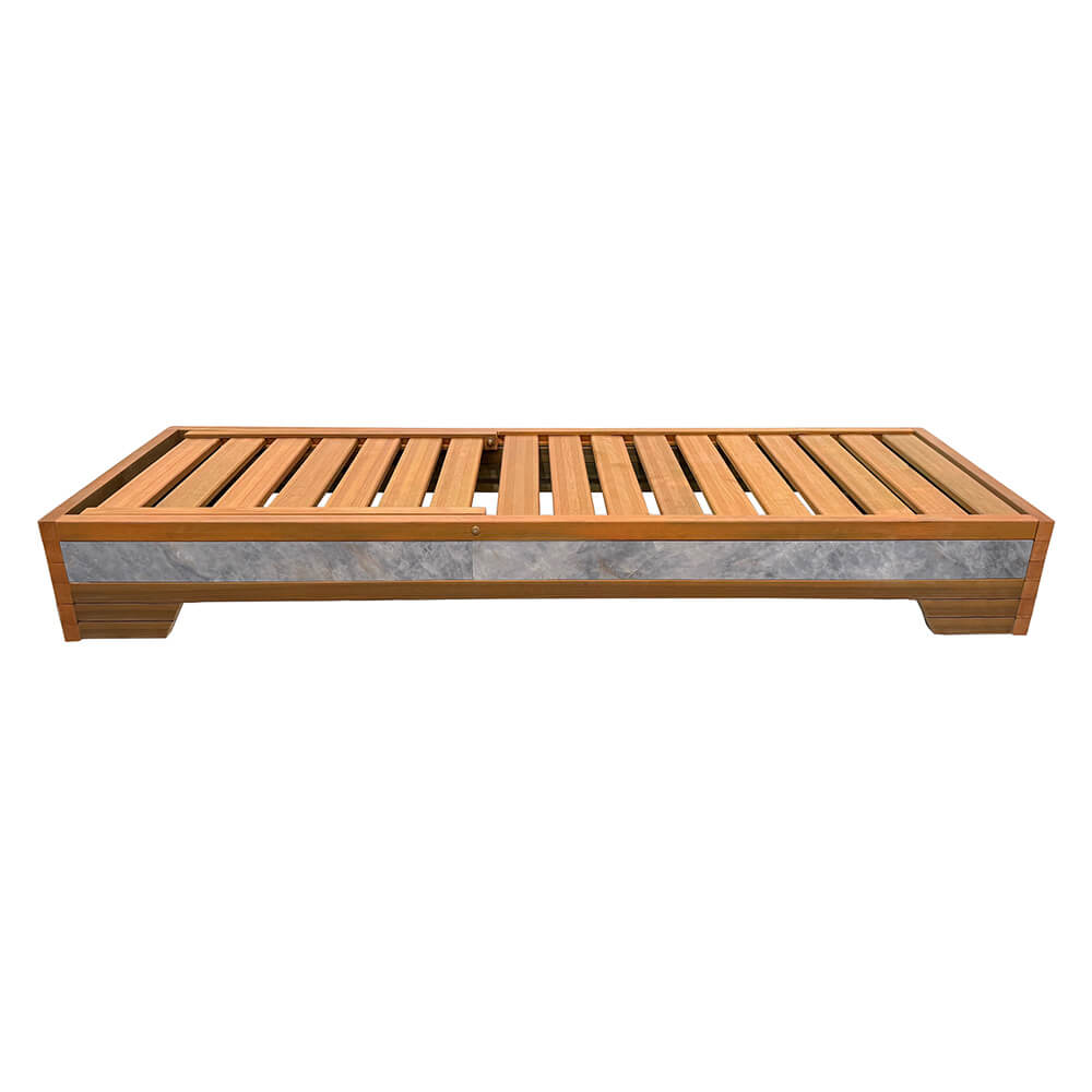 Η εταιρεία μας Group κατασκευάζει αυτήν την ξαπλώστρα παραλίας εξολοκλήρου από φυσικό ξύλο.