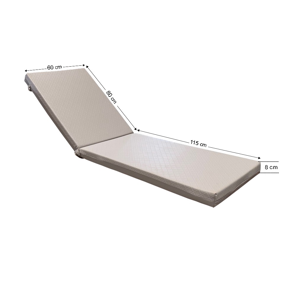 Τεχνικά χαρακτηριστικά Δερματίνη με βάρος 535 gr/m2 Αδιάβροχο 100% Δερματίνη με σύνθεση 85% PVC και 15% PES, για μέγιστη στη αντοχή σε σχισιματα και τριβή Αντοχή στον ήλιο 7PU (πολύ υψηλό) Πάχος στρώματος 4 - 6 - 8 - 10 cm Πυκνότητα ΑΦΡΟΛΕΞ 25kg/m3 Καθαρίζεται πολύ εύκολα με ένα σφουγγαράκι ή πανί Περιέχει ιμάντα στο πάνω μέρος του στρώματος ώστε να περνάει εύκολα στο πίσω μέρος της πλάτης της ξαπλώστρας για εύκολη τοποθέτηση Επιπλέον κορδόνια για να μπορεί να δεθεί το στρώμα και στη μέση της ξαπλώστρας Φερμουάρ για να μπορεί να βγει το ύφασμα και να πλυθεί Σε τέσσερις διαθέσιμους χρωματισμούς Έξτρα μαξιλαράκι στο πάνω μέρος του στρώματος με επιπλέον χρέωση Συνιστάται η δερματίνη να συντηρείται με κρέμα δέρματος για μέγιστη διάρκεια ζωής Το PU είναι μονάδα μέτρησης που αφορά την αντοχή στον ήλιο.