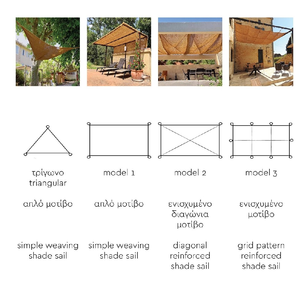 Τα πανιά σκίασης κοκοφοίνικα διατίθενται σε 3 διαφορετικά Models, τα οποία διαφέρουν στο μοτίβο ραφών / ενίσχυσης της κατασκευής:
