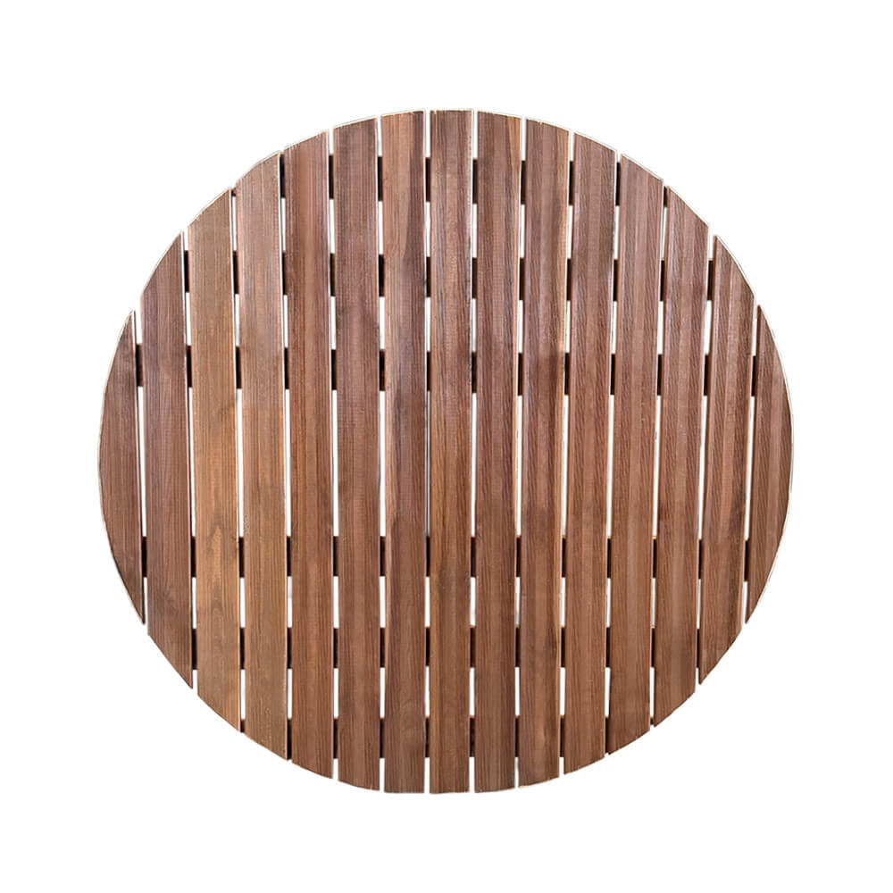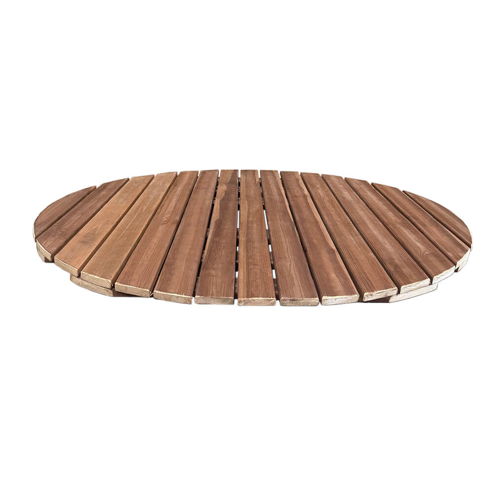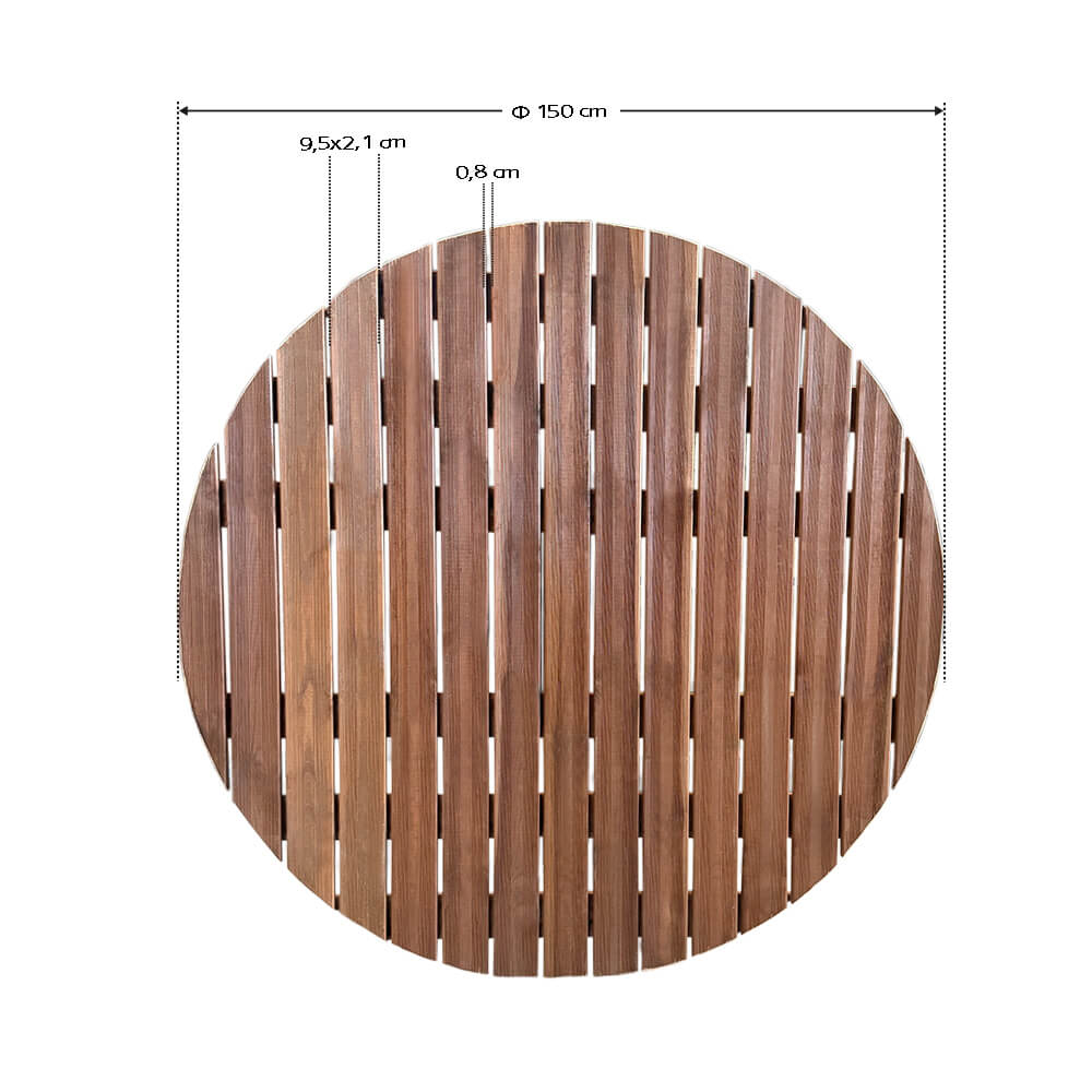 Βάρος: 30kg Πάχος ξύλου: 2,1cm Διαστάσεις: Φ150cm Συνδέσεις με γαλβανιζέ καρφιά 3cm Εμποτισμός Αφού το ξύλο πάρει την τελική του μορφή μπαίνει σε ειδικούς κλιβάνους οι οποίοι γεμίζουν με νερό και συντηρητικό και κατόπιν δέχεται πίεση 12 ατμόσφαιρες για 3 περίπου ώρες με αποτέλεσμα το συντηρητικό να διεισδύει έως την καρδιά του ξύλου και να σταθεροποιούν την δομη του.