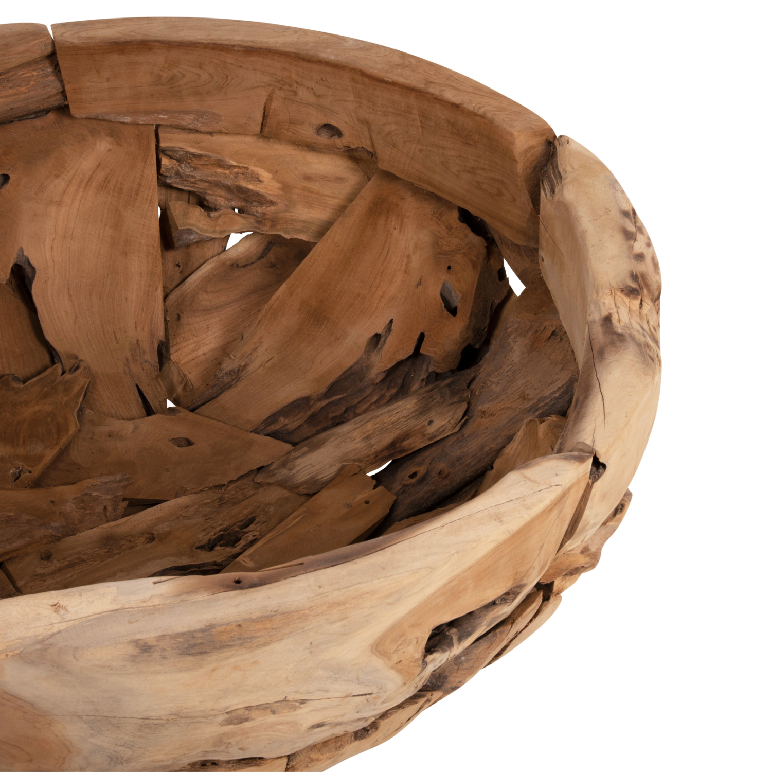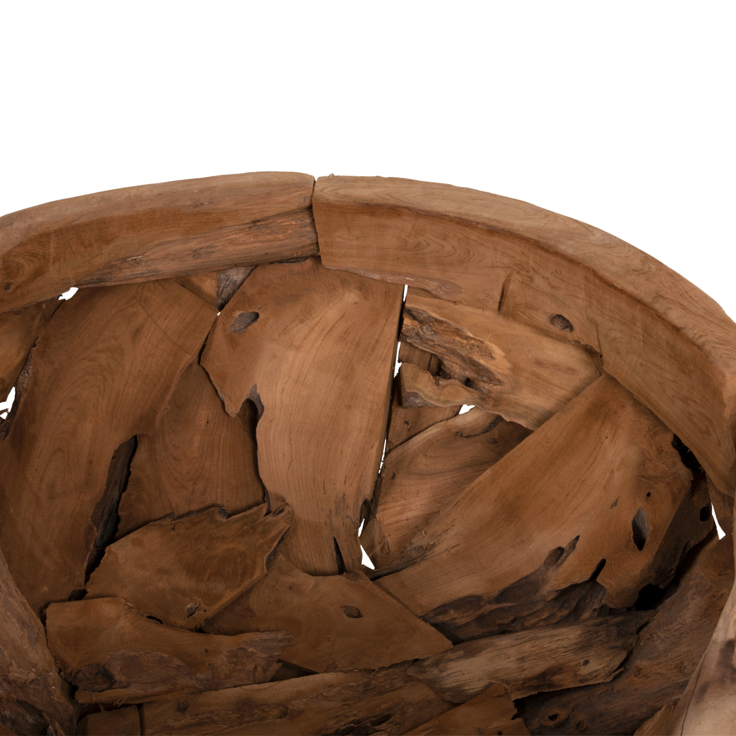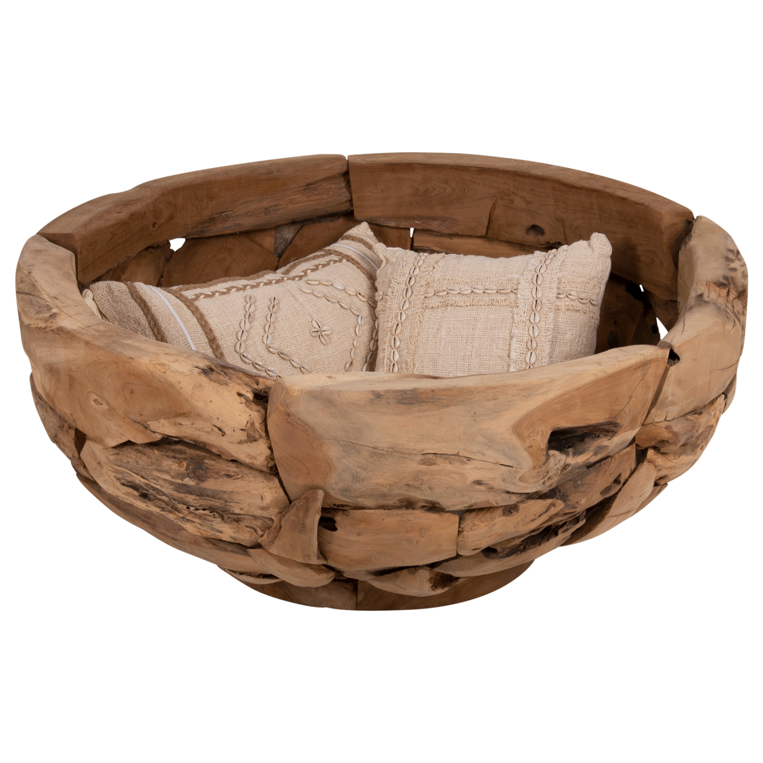 Σας παρουσιάζουμε το υπέροχο τραπέζι σαλονιού HM4279. Πρόκειται για ένα χαμηλό και στρογγυλό τραπέζι από φυσικά κομμάτια ποιοτικού ξύλου ΤΕΑΚ χωρίς πόδια. Στηρίζεται σε μια βάση από τα ίδια ξύλα και έχει την μορφή ενός μεγάλου μπολ. Στο εσωτερικό μπορείτε να τοποθετήσετε διάφορα αντικείμενα ή διακοσμητικά για να δώσετε την εικόνα που θέλετε στον χώρο σας, όπως διακοσμητικές γυαλισμένες πέτρες διαφόρων χρωμάτων, ή μαξιλάρια, ή οτιδήποτε άλλο. Η γυάλινη επιφάνεια ΔΕΝ περιλαμβάνεται στο πακέτο για λόγους ασφαλείας.