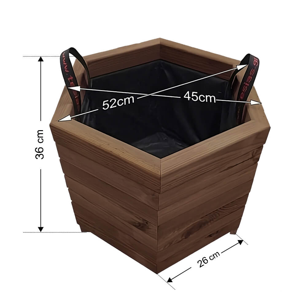 Διαστάσεις Μήκος: 52cm Πλάτος: 45cm Ύψος: 36cm Βάρος: 15kg Λίτρα χώματος: 75lt Τεχνικά Χαρακτηριστικά Είδος ξύλου: Σουηδική εμποτισμένη πεύκη.