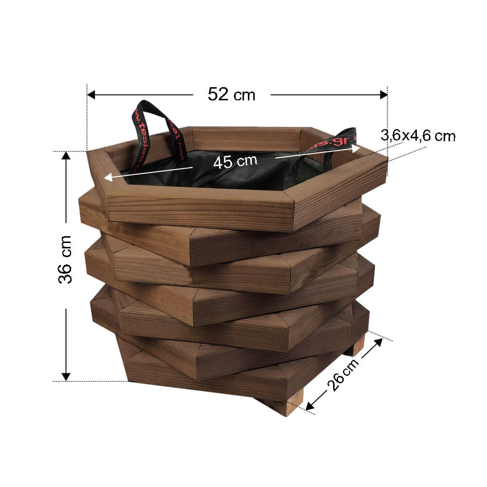 Διαστάσεις Μήκος: 52cm Πλάτος: 45cm Ύψος: 36cm Βάρος: 15kg Λίτρα χώματος: 60lt Τεχνικά Χαρακτηριστικά Είδος ξύλου: Σουηδική εμποτισμένη πεύκη.