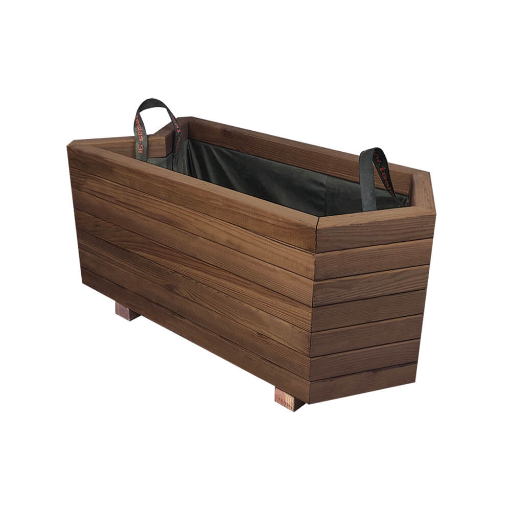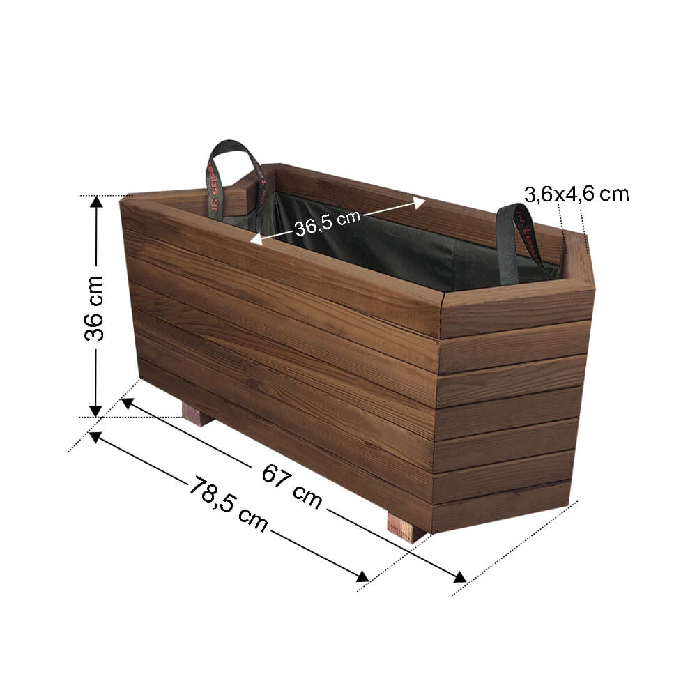 Τεχνικά Χαρακτηριστικά Μήκος: 78.5cm / 67cm Πλάτος: 36.5cm Ύψος: 36cm Βάρος: 20kg Λίτρα χώματος: 55lt Προτάσεις διακόσμησης Ιδανικές για εισόδους μαγαζιών ώστε να κατευθύνους τους πελάτες Μπορούν να ενωθούν σχηματίζοντας ενιαίο σώμα Οριοθετούν και "κλείνουν" αισθητικά γωνίες και ασυμμετρίες του χώρου Χαρακτηριστικά Είδος ξύλου: Σουηδική εμποτισμένη πεύκη.