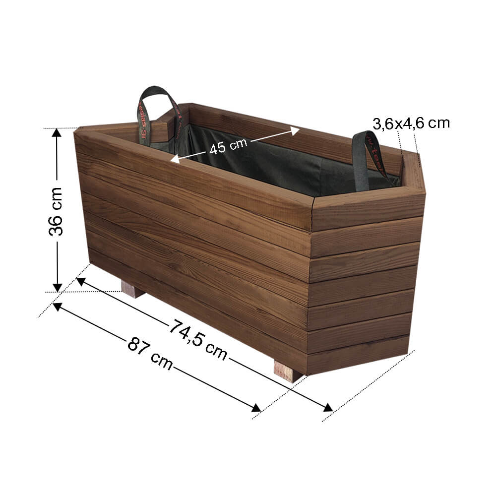 Μήκος: 87cm / 74.5cm Πλάτος: 36cm Ύψος: 36cm Βάρος: 23kg Λίτρα χώματος: 100lt Προτάσεις διακόσμησης Ιδανικές για εισόδους μαγαζιών ώστε να κατευθύνους τους πελάτες Μπορούν να ενωθούν σχηματίζοντας ενιαίο σώμα Οριοθετούν και "κλείνουν" αισθητικά γωνίες και ασυμμετρίες του χώρου Χαρακτηριστικά Το ξύλο είναι πρώτης ποιότητας, φουρνισμένο κι εμποτισμένο, 36mm x 46mm.